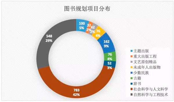 图书规划的部分涵盖主题出版、重大出版工程、文艺原创精品、未成年人出版物、少数民族、古籍、辞书、社会科学与人文科学、自然科学与工程技术9大领域。尤以社会科学与人文科学(548项)、自然科学与工程技术(783项)为多。社会科学与人文科学下又分哲学(37项)、政治(75项)、法律(35项)、军事(22项)、经济(109项)、历史(125项)、地理(17项)、文化(92项)、教育(38项)、语言文字(24项)、中国文学(48项)、外国文学(29项)、艺术(132项);自然科学与工程技术下细分为自然科学总论、数理科学和化学等20个子项。
