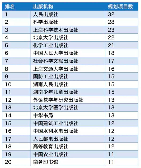 表1:出版社“十三五”重点图书规划项目数量TOP20