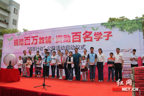 在启动仪式上,永州市委副书记张严代表永州新华书店,向零陵区神仙岭小学图书室赠送了价值2万元的图书,10位新华书店青年志愿者给10名贫困学生代表送上了教辅材料和学习用品。