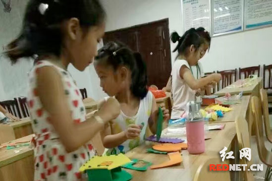 7月23日,来自长沙市各处的中小学生集合在南家塘社区二楼图书分馆,为24日的“为爱行走 为爱义卖”做出各类手工物品。