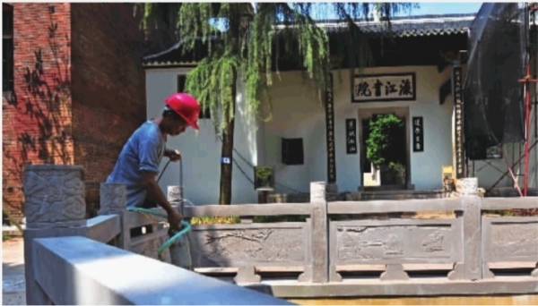 7月26日上午,醴陵市渌江书院,一名施工人员准备取水浇灌新栽的树木。该书院于乾隆18年(1753)创建,1996年被省政府公布为省级文物保护单位。书院保护性整治建设于今年1月全面启动,主要建设内容包括书院本体文物修缮、文物周边环境整治和建设。预计今年8月底,书院陈列布展全面完成并对外开放。记者 田超 摄
