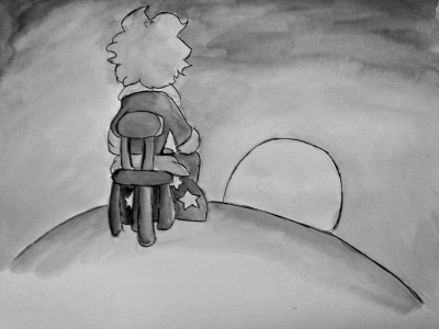 《小王子》第六章插图: 坐在小星球上看日落的小王子。