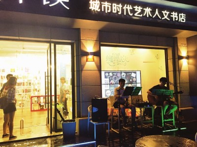 两个小伙子在书店外的露台上抱着吉他弹唱蓝调。这样的微型音乐会已举办了数次,每次一个主题。本报记者李静摄
