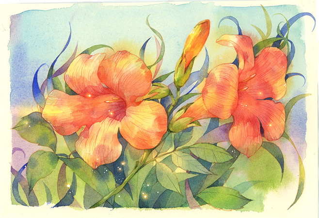 空阶,苔径,园子里飘散着草木香馥之味。无论怎样,凌霄花真的很美。藤枝下垂,一枝十来朵,有点儿像喇叭花,稍大,但花卷儿纤细一些,花瓣稍微厚一些。颜色呢,深红里渗着微黄,看上去更加可人。兰要的是一股子幽劲儿,牡丹则是一场霸气华丽。而凌霄花,是有冷艳感——冷冽里含着笑的那种,说冷也冷,说暖也暖。快要萎谢的花朵,花筒皱缩卷曲,色泽涩,竟有些闲逸的感觉——似乎萎谢也是一件超尘脱俗的事。(刘梅花)