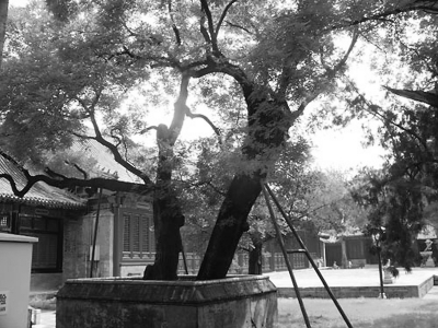 关于国子监的古槐,据史料载,在元明时,北京的国子监内有国槐古柏二百余株,以古槐为多。随着年代的推移,现存古槐古柏仅四十余株。国子监里的古槐大多种植于元代,距今已七百多年。在这些古槐中,最著名的两棵,是位于彝伦堂前西侧的“吉祥槐”和辟雍殿西侧的“罗锅槐”。