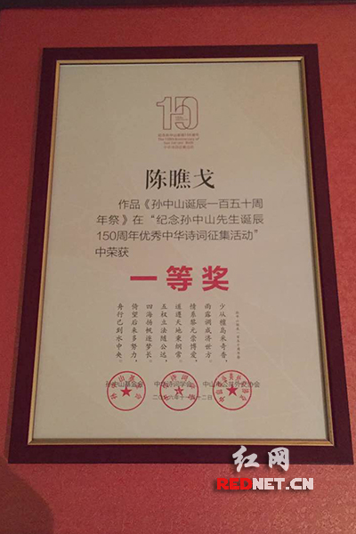陈樵哥荣获“纪念孙中山先生诞辰150周年优秀中华诗词征集”活动一等奖。