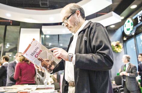 11月23日,在智利首都圣地亚哥,一名参观者在翻阅介绍中国的图书。新华社发