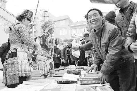 11月28日是广西隆林各族自治县德峨镇的圩日(集市开市的日子),该县新华书店流动售书车来到镇上开展文化惠民活动,书店员工穿着民族服装,用民族语言与群众交流,成为一道亮丽的风景。
