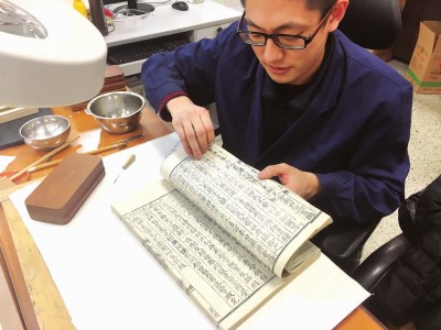 “85后”崔志宾正小心翼翼地修复一册元版《事文类聚翰墨全书》,这套书共有40余册,需一页页拆开、修补,再重新装订。她面前的这页古籍,布满大大小小的虫洞和发霉的痕迹,需要用浆糊和补纸逐一填上。她说,这类修复难度属“中低等”,她一天共完成20来页。“这份工作让我越来越有耐心,能接触不同年代、不同材质以及不同装帧形式的宝贝,修好一本书特别有成就感。”从首都师范大学美术史硕士一毕业,她便投入了故纸堆中。当问及她所学专业对古籍修复的影响时,她坦言:“修古籍不能只做一个匠人,也要有一定美学修养,比如在配纸染色环节,我的专业优势就比较明显。”