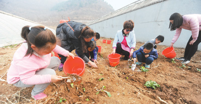 3月20日是农历二十四节气中的春分。俗话讲:“春分麦起身,肥水要紧跟。”3月19日,在北京平谷区大华山镇挂甲峪村,绿油油的青菜苗、各种各样的农具让城里的孩子兴奋不已,他们争先恐后向农民叔叔阿姨学干农活。当日,“学民俗 迎春分”活动在挂甲峪村举行,数百名家长和孩子通过参加种植菜苗、手磨豆腐等民俗活动,迎接春分节气的到来。