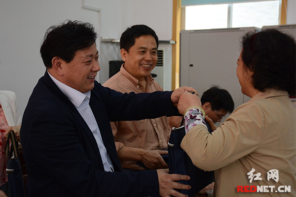 湖南省文化厅副厅长鄢福初向“梅花奖”演员代表左大玢赠送新书。