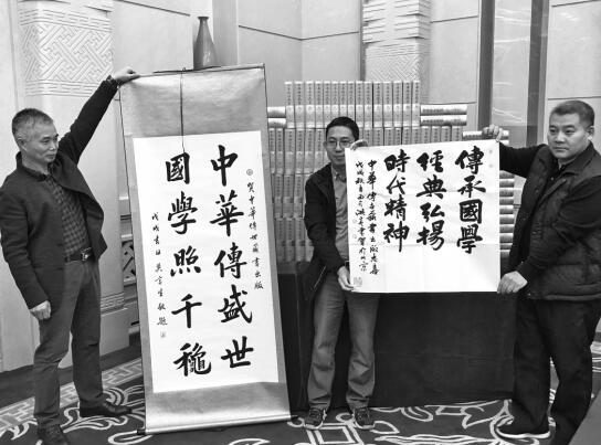 首发式上,编辑展示中国书画院副秘书长洪亮(右)和陕西师范大学文学院教授吴言生(左)给该套藏书的题词。