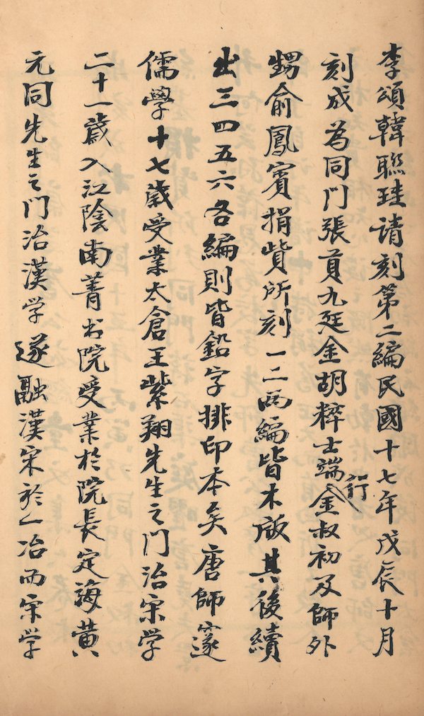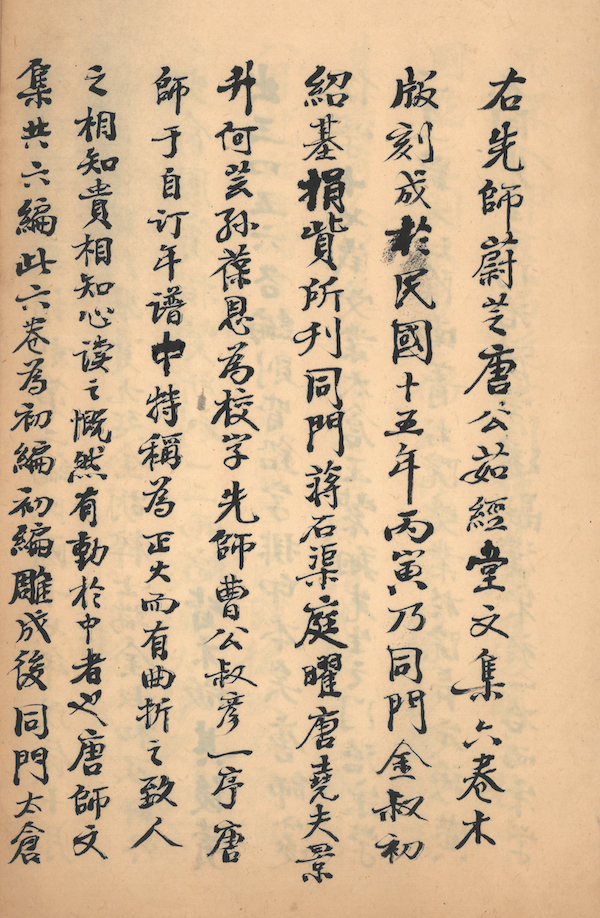 一、关于《茹经堂文集》事,您复印给我的序文及篇目,乃是《茹经堂文集》的初编,是木刻本。初编以后,还有二编、三编、四编、五编、六编,都是铅字排印本,未刊木版,因价昂之故。贵处只有初编六卷,仅占《茹经堂文集》全集的六分之一。如果贵处把它出版,似乎太少,并且不是全集。命联作跋,仅能就初编作跋,拟奉赐教。