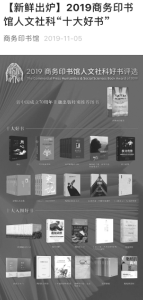 “商务印书馆人文社科好书评选”被中央电视台等媒体称为“年度图书榜单风向标”。每每公布后,央媒及主流媒体都会予以报道,同时在新媒体平台也会进行系列宣传,比如2019年的好书评选人民日报官方微信发布后一天内的阅读量便超过了888万。