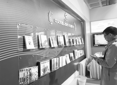 在今年的北京图书订货会上,读者在中文传媒年度好书展墙前驻足。