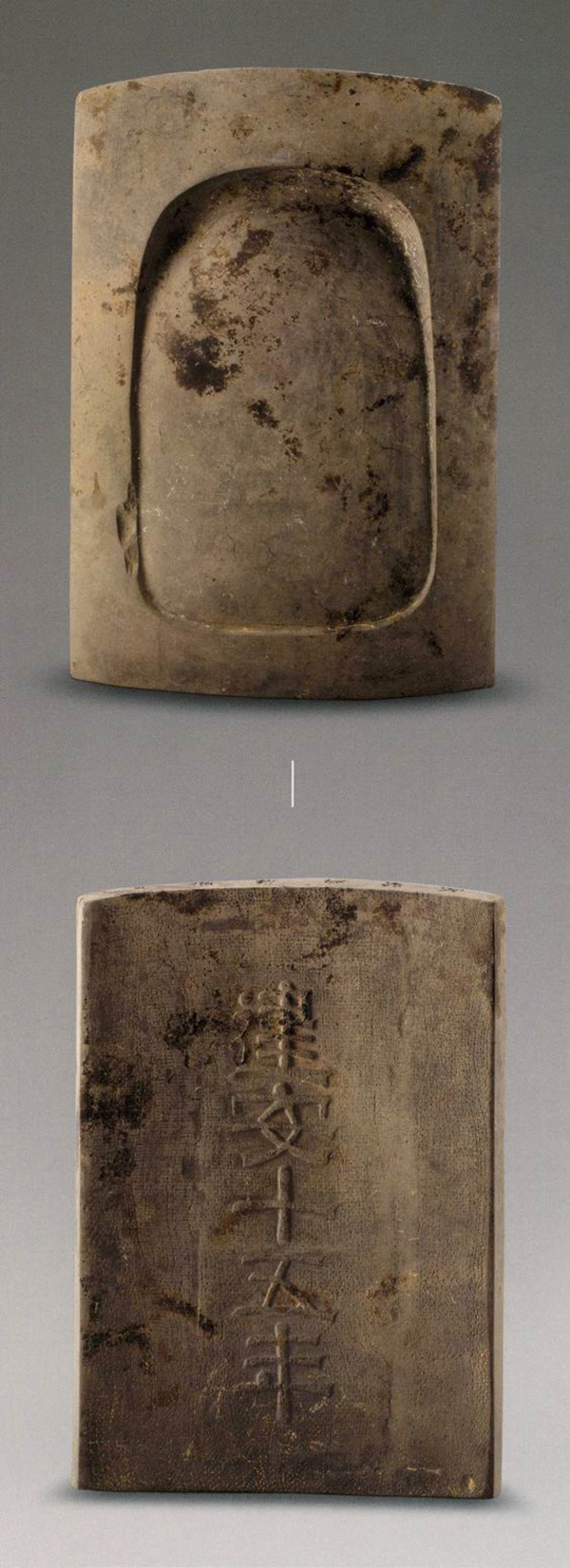 见载于《西清砚谱》的“铜雀瓦砚”〔图一〕,是指使用邺城铜雀台建筑上的瓦制成的砚。从材质上说,可被视作是陶砚的一种。陶砚在两汉南北朝时期已出现,尽管相较于其他材质的砚台可能存在吸水率大、质地不够坚硬的缺点,但制作受地域的限制小,又简便易得,成本相对低廉,因此使用者也较多。