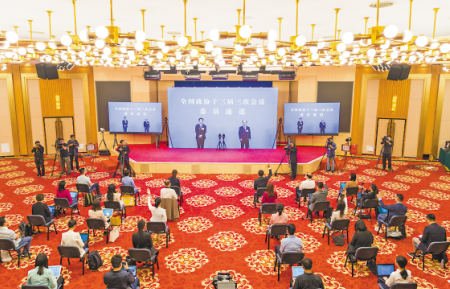 5月21日,在北京人民大会堂新闻发布厅举行全国政协十三届三次会议第一场“委员通道”采访活动。今年的“委员通道”采访活动采取网络视频的方式举行,政协委员在人民大会堂现场“隔屏”回答记者的提问。全国政协十三届三次会议新闻中心 供图
